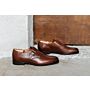Cette chaussure cuir est réalisée en cousu Blake sur semelle cuir avec patin, avec un dessus en veau box aniline patiné à la main et trépointe en cuir. Un must avec des pantalons classique ou des costumes ajustés.