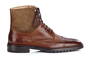 Réalisée en cuir patiné et velours traité hydrofuge, sur une semelle gomme crantée et lacets ronds cirés ton sur ton guidés par des œillets invisibles et trois crochets en laiton.