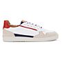 Empiècements, renfort arrière et bande de côté en cuir de mouton et velours. Languette en mesh. Œillets invisibles et lacets plats en coton cirés. Première amovible en cuir de vachette.