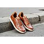 Empiècements, renfort arrière et bande de côté en cuir de mouton et velours. Languette en mesh. Œillets invisibles et lacets plats en coton cirés. Première amovible en cuir de vachette.