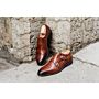 Réalisée en cousu Blake et veau italien patiné à la main sur semelle cuir avec trépointe en cuir. Ce modèle sera toujours de circonstance avec un costume.