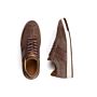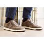 Empiècements, renfort arrière et bande de côté en cuir de mouton et velours. Languette en mesh. Œillets invisibles et lacets plats en coton cirés. Première amovible en cuir de vachette.