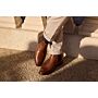 Disponible en cuir de veau box patiné à la main, sur semelle en cuir avec patin gomme intégré, avec trépointe en cuir. Élastiques latéraux ton sur ton et languette arrière en cuir.