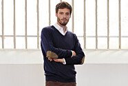 Idéal en toute saison, Vadim est un pull col V homme coupe standard, avec coudières contrastantes en 100% cuir véritable, pour un look ultra-chic.